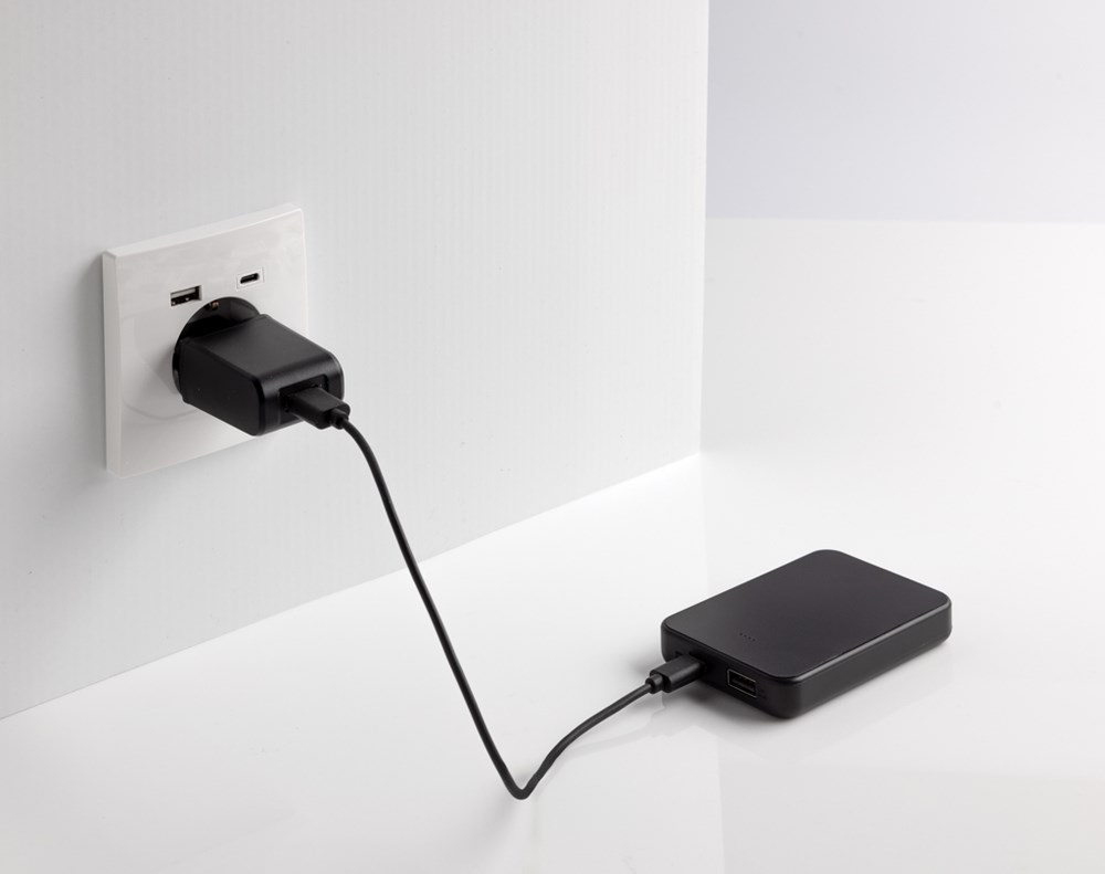 5.000 mAh Powerbank im Taschenformat mit USB-C-Eingangs-/Ausgangsanschluss und zusätzlichem USB-A-Anschluss. Das Gehäuse besteht aus RCS-zertifiziert recyceltem ABS-Kunststoff. RCS (Recycled Claim Standard) ist ein Standard zur Überprüfung des Recyclinganteils eines Produkts in der gesamten Lieferkette. Gesamtrecyclinganteil: 25% basierend auf dem Gesamtgewicht des Artikels. Bei voller Ladung liefert die Powerbank genug Energie, um Ihr Mobiltelefon bis zu zweimal aufzuladen. Die Powerbank enthält einen langlebigen A-Grade Lithium-Polymer-Akku mit 5.000mAh. Die Energieanzeige gibt den verbleibenden Energiestand an, sodass Sie immer wissen, wann Sie sie wieder aufladen müssen. Type-C-Input: 5V/2,4A; USB-A Output: 5V/2,4A, Type-C-Output: 5V/2A. Artikel und Zubehör PVC-frei. Mit RCS-zertifiziertem Ladekabel aus recyceltem TPE. Verpackt in FSC®-Mix-Verpackung.