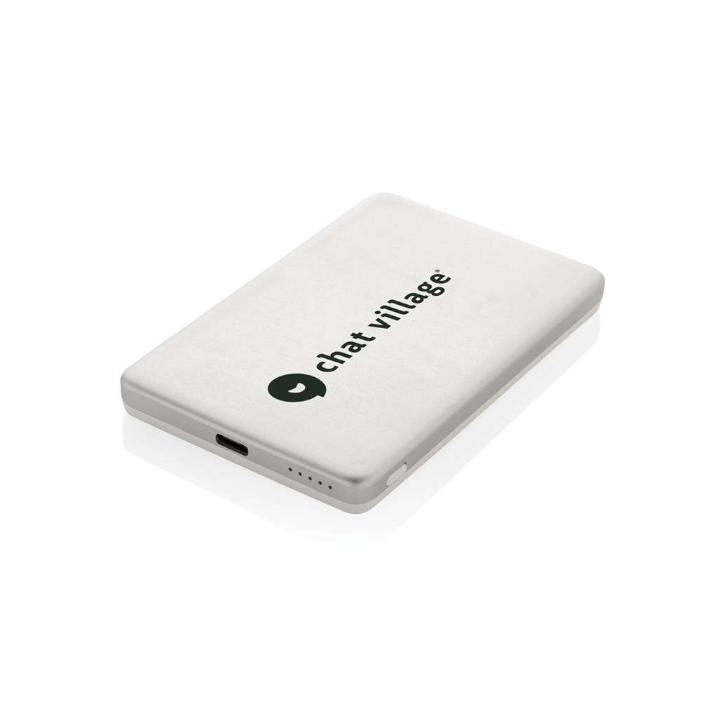Ultradünne 5.000mAh Powerbank mit magnetischem, kabellosem 5W-Ladegerät, bei der das Gehäuse aus RCS-zertifiziert recyceltem Aluminium und recyceltem ABS-Kunststoff hergestellt ist. RCS (Recycled Claim Standard) ist ein Standard zur Überprüfung des Recyclinganteils eines Produkts über die gesamte Lieferkette hinweg. Recycelter Gesamtanteil: 23%, bezogen auf das Gesamtgewicht des Artikels. Die Powerbank enthält einen langlebigen 5.000mAh-A-Grade Lithium-Polymer-Akku. Die Ladestandsanzeige zeigt den verbleibenden Energiestand an, damit Sie immer wissen, wann Sie wieder aufladen müssen. Type-C-Input: 5V/2,4A; USB-C-Output: 5V/2A.4A. Artikel und Zubehör sind PVC-frei. Inklusive RCS-zertifiziert recyceltem TPE-Ladekabel. Verpackt in FSC®-Mix-Verpackung.