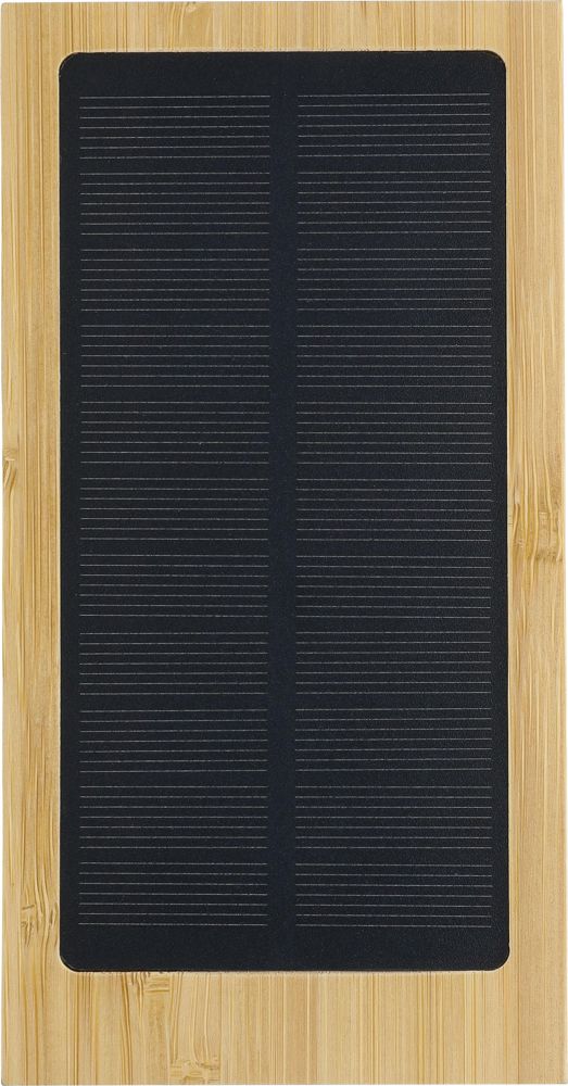 Die Bambus-Solarstrombank verfügt über eine Kapazität von 10.000 mAh, zwei USB-A-Ausgänge sowie zwei Typ-C-Anschlüsse für Eingang und Ausgang. Auf der Rückseite befindet sich ein Wireless Charger mit einem lasergravierten Symbol und fünf Kontrollleuchten. Auf der Oberseite ist ein 6,3 x 12,8 cm großes Solarpanel angebracht. Der kabellose Ausgang beträgt 5 V DC/1 A (5 W), der kabellose Ladeabstand 6 mm. Eingang/Ausgang über Kabel: DC 5 V/2,4 A. Die Powerbank ist mit Kurzschluss-, Überladungs- und Überentladungsschutz ausgestattet. Ein 30 cm langes weißes Kabel ist inklusive. Das Produkt ist einzeln in einer braunen Pappschachtel verpackt.