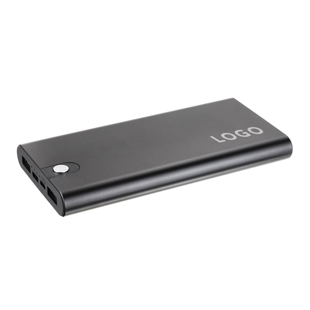 Markante Powerbank mit 10.000 mAh Hochleistungsakku, solidem Aluminium-Gehäuse, doppeltem USB-Output, Typ C In- und Output, sowie Ladestandsanzeige. Der dominant gestaltete Power-Button integriert in das schwarze oder silberne Uni-Body-Case macht Flat 10 zu einem eleganten Werbegeschenk für anspruchsvolle Marken. Individuell mit Ihrem Logo als Lasergravur oder brillantem Druck.