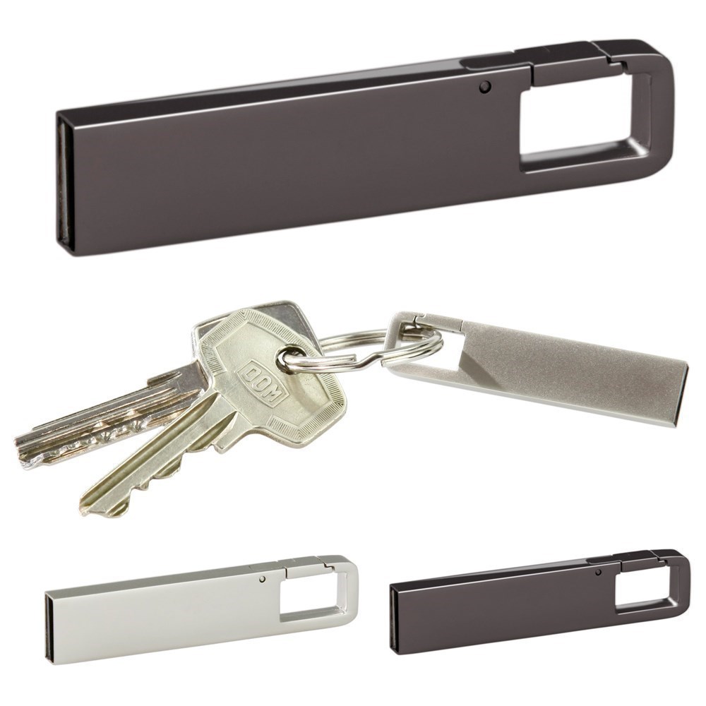 Kleiner USB Stick aus Metall mit einem Karabiner-Haken. Ideal für schnelles Lösen und Befestigen am Schlüsselband. COB-Chiptechnologie. Standardverpackung Teabag.